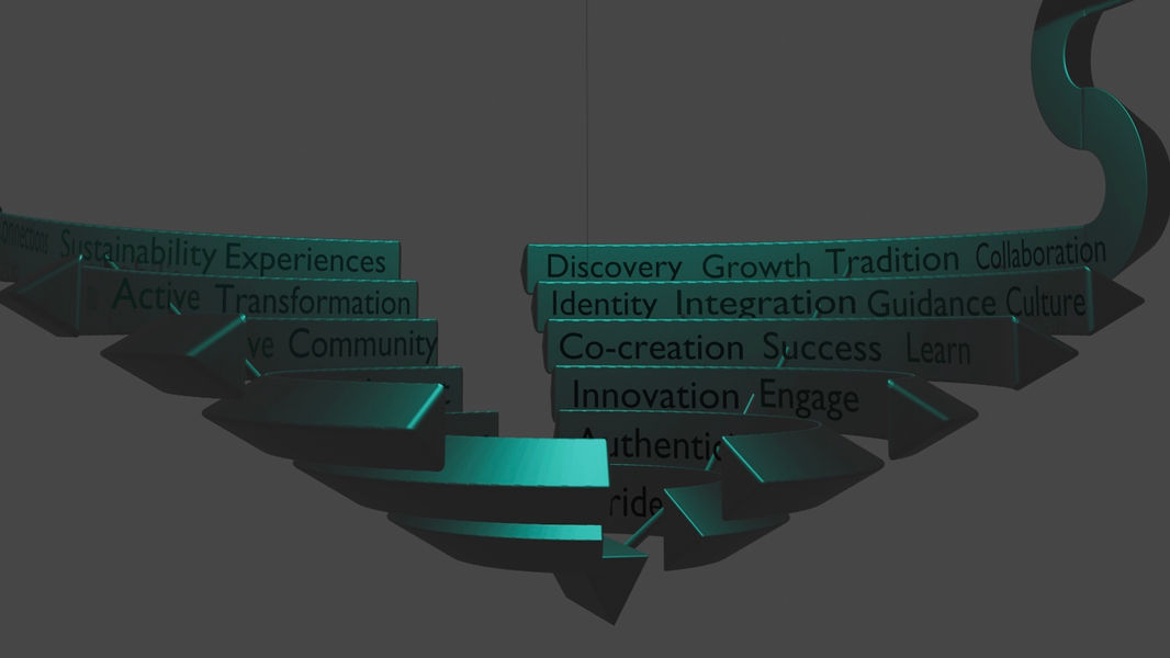 This suspended sculpture was designed to portray an abstracted, aluminum form of two eagles flying in mid-air while connecting to one another to build a nest in between themselves. The wings of the eagles are spread to create a spherical form, symbolizing the global nature of UNT. The decision to include two eagles is inspired by the fact that eagles mate and nest for life. This eagle pair signifies the lifelong connections and friendships that students make during their experience at UNT and emphasizes the importance of community and companionship during college. The engraved words throughout the interior describe the important values of UNT Frisco, and are highlighted by two LED lights placed at both central points. My proposal was selected by UNT Frisco as one of the three finalists in September 2021.